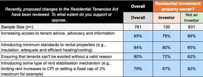 • 78% overall support from residential investment property owners.