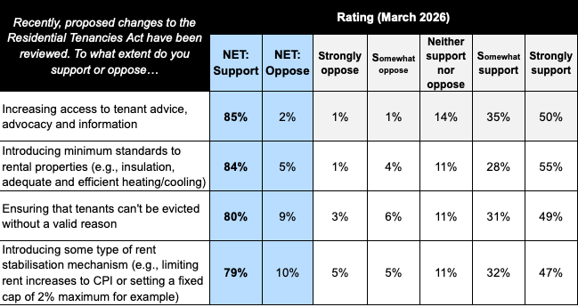 “Our new polling shows that there is clear, broad-based support for strengthening protections for renters, including an end to no-grounds evictions and the introduction of minimum standards for rental properties. These results should give the government real confidence to move forward, knowing the community is firmly behind them and ready for change.